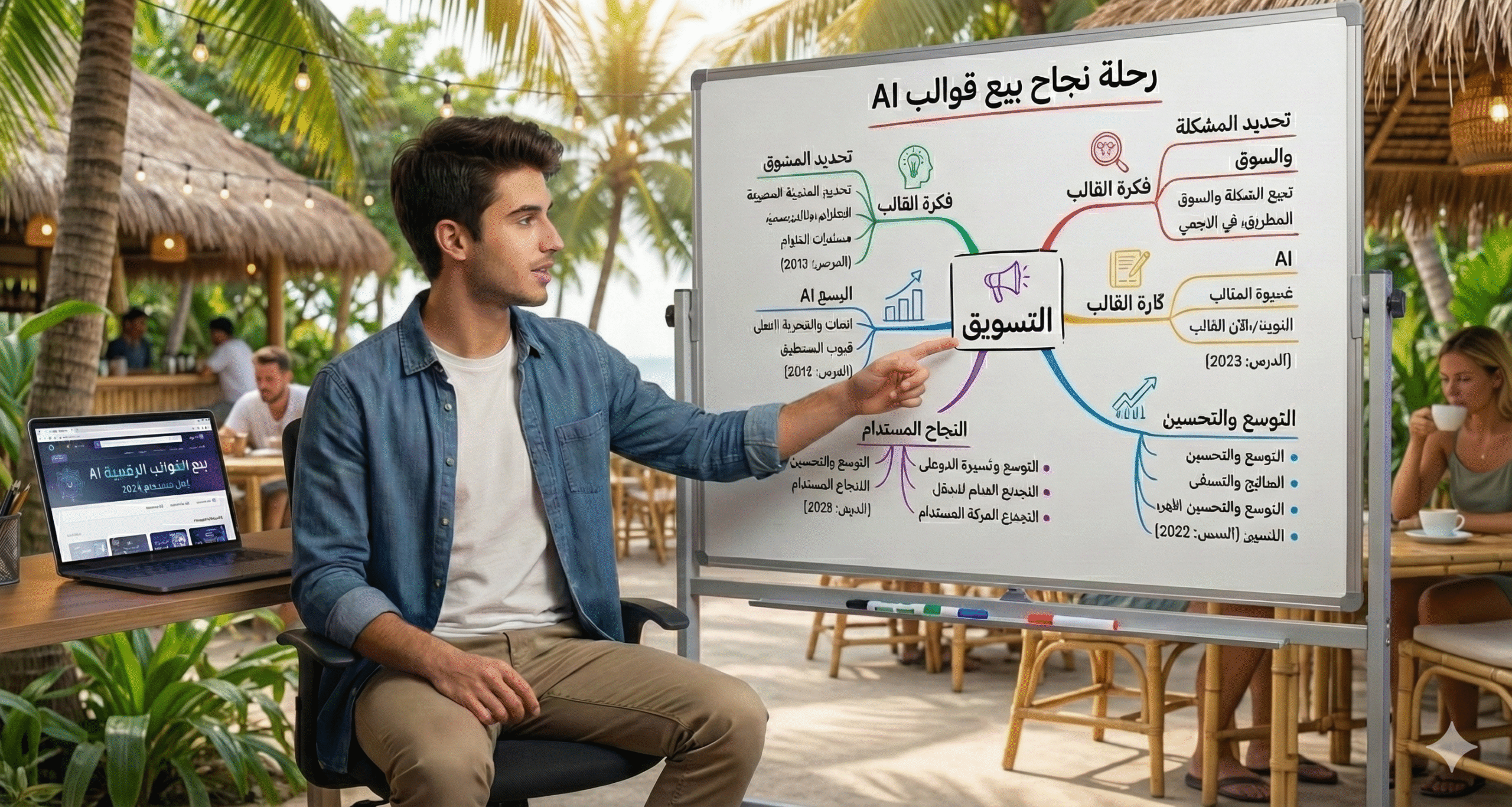 يوضح هذا المخطط الذهني رحلة النجاح في بيع قوالب الذكاء الاصطناعي، من الفكرة الأولية وتحديد الأدوات، مروراً بالانطلاق والتسويق، وصولاً إلى النمو المستدام والعوامل الرئيسية التي أدت إلى هذا النجاح.